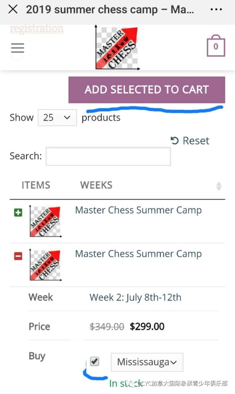 2. 选择报名week和location,小方块里打勾,点”add selected to cart”。
