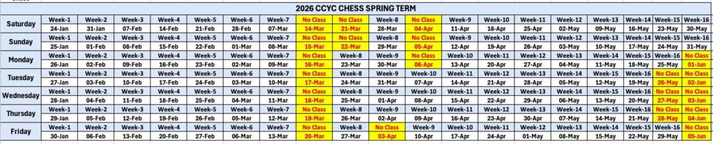 2026 Chess Spring term is from Jan-24, 2026 to May-31, 2026. There are 16 weeks, 1 class per week for each group; 90 minutes per class, including lectures and practices; Students could use online self-assess tools to decide their level or contact customer service to arrange assessment during school time;