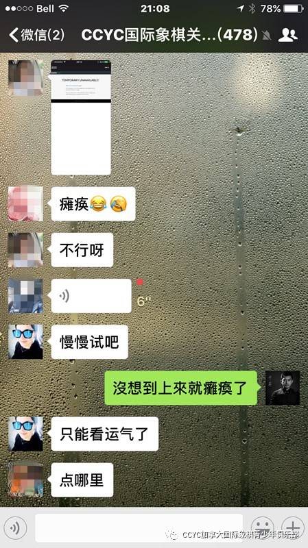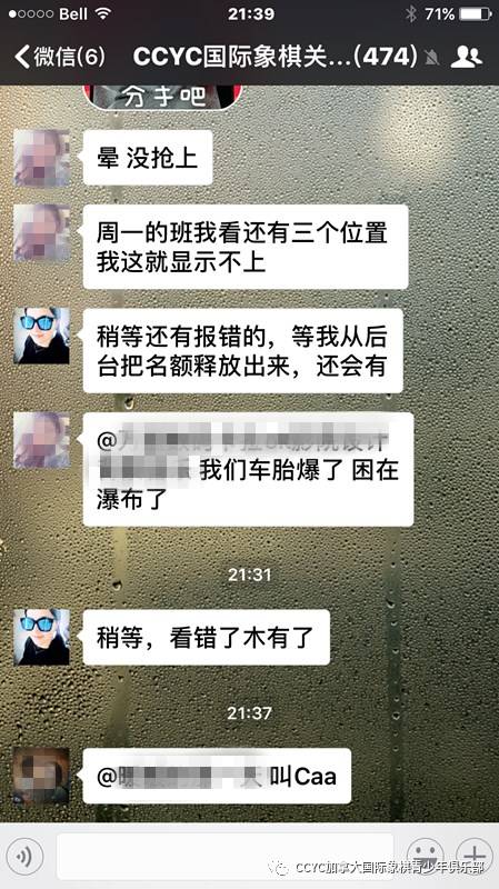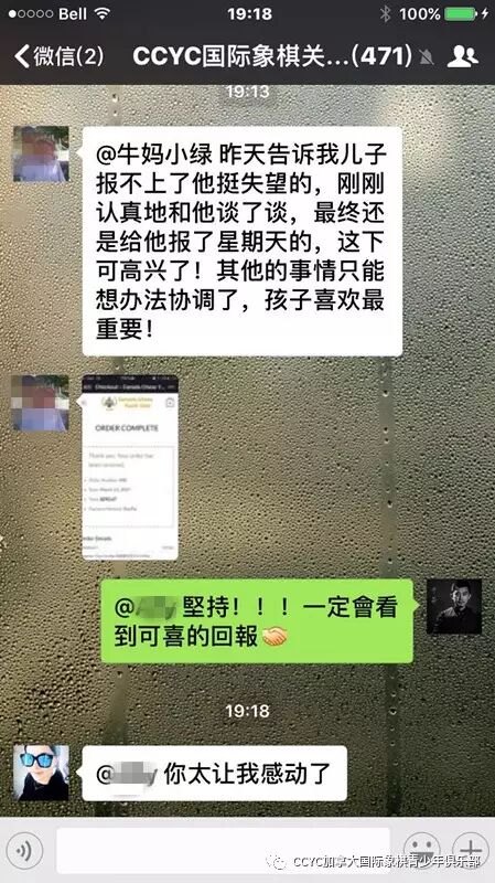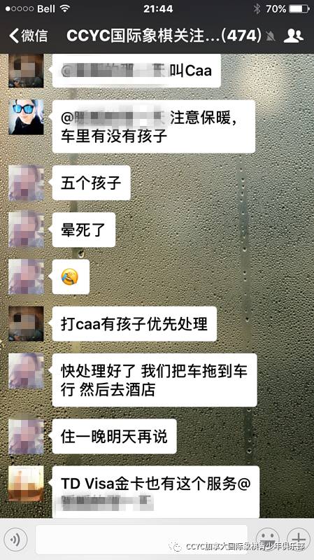 所有人一看到车上有五个孩子的时候,心都不约而同的揪紧了,当时的室外体感温度接近零下20度,且伴有六七级大风和小雪,在大家你一言我一语的出主意想办法安慰那位家长的时候,我也马上私信和她取得了联系,亲耳听她描述了当时的情况:正在大瀑布游玩,仍抽出时间在规定放出报名链接的时间用手机准时点开,结果赶上网瘫,就一遍遍不停地在车里刷手机生怕错过,此时她的车胎正赶上慢撒气,就在网络不佳一遍遍反复刷手机未果的过程中,漏光了车胎里的气,不得不叫救援拖车,即使如此,在等待救援的过程中,这个姐们儿还在不停的刷着手机报名!当时车上有五个孩子!幸亏车上油还够,否则冰天雪地的情况下后果不敢继续往下设想了……我听完以后第一反应是也许不刷手机他们能够及时赶到修车地点,就不用再叫拖车和耽搁住店了,只能说真的是太太太重视这件事了!这是一个当天下午我们才互加了微信的孩子妈妈,也是一个为了孩子的教育可以做到如此认真执着的孩子妈妈,请允许我在此向你表达我的敬意,并预祝孩子们在chess学习中找到快乐、有所成就!